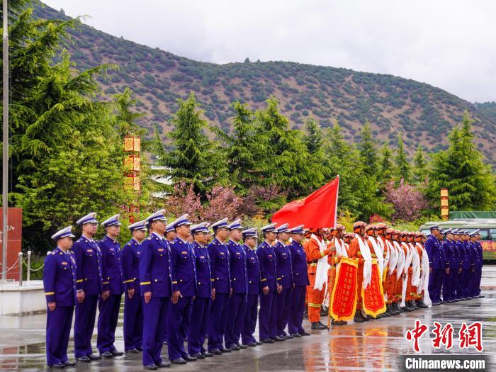 林芝市森林消防支隊(duì)營(yíng)區(qū)人員列隊(duì)歡迎駐防分隊(duì)歸來(lái)。李國(guó)燾 攝