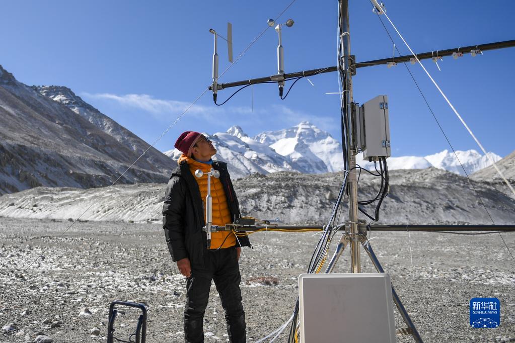 在珠峰登山大本營,科研人員檢查臭氧通量裝置運(yùn)行情況(5月3日攝)。新華社記者 姜帆 攝