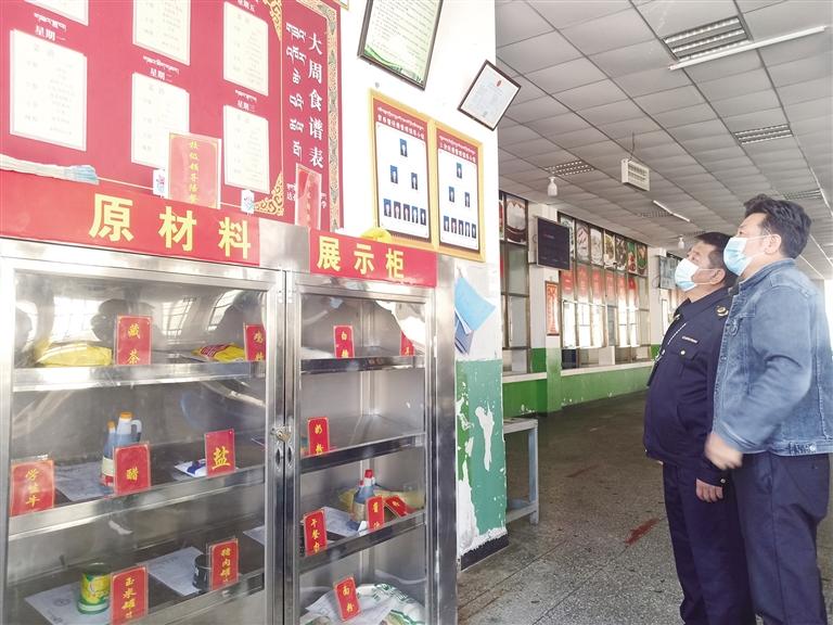 拉薩市市場監(jiān)管局執(zhí)法人員檢查學?!盎ヂ?lián)網(wǎng)+明廚亮灶”工程。