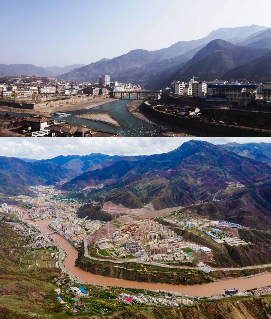 拼版照片:上圖是2009年3月15日拍攝的昌都(新華社記者 普布扎西 攝);下圖是2022年5月22日拍攝的昌都市卡若區(qū)(新華社記者 周荻瀟 攝,無人機照片)。新華社發(fā)