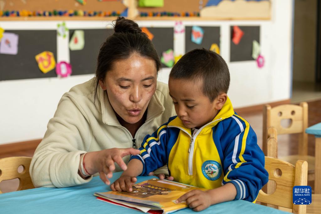 在西藏自治區(qū)山南市貢嘎縣森布日村,幼兒園老師教霍黨生讀書(3月22日攝)。新華社記者 周荻瀟 攝