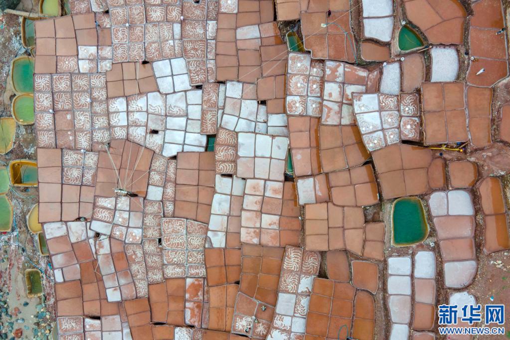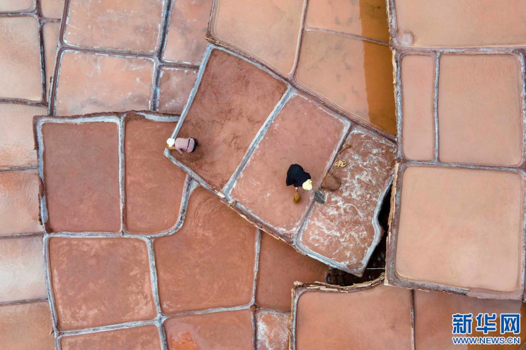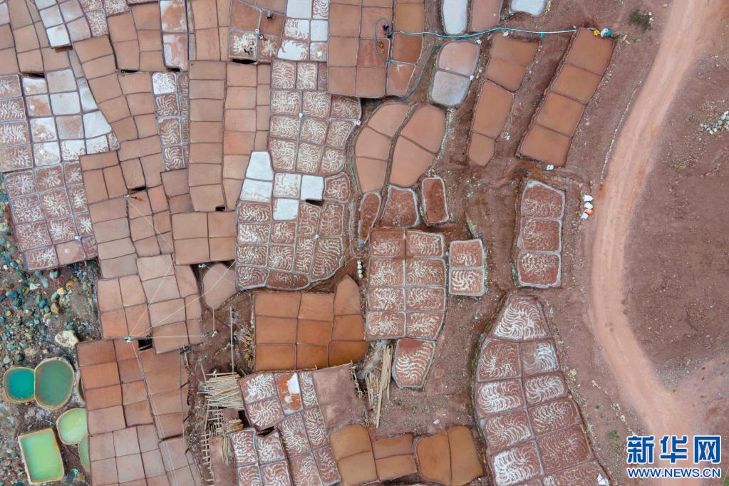 加達村村民在古鹽田里勞作(無人機照片,5月26日攝)。新華社記者 周荻瀟 攝