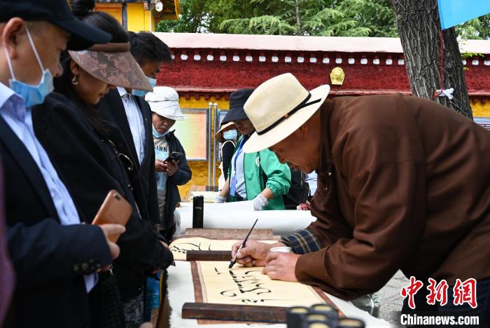 圖為活動(dòng)現(xiàn)場,藏文書法展示?!≮w朗 攝