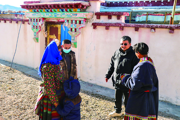 王軍強(qiáng)(右二)在巴扎鄉(xiāng)結(jié)對(duì)幫扶達(dá)吉家中了解生活情況。