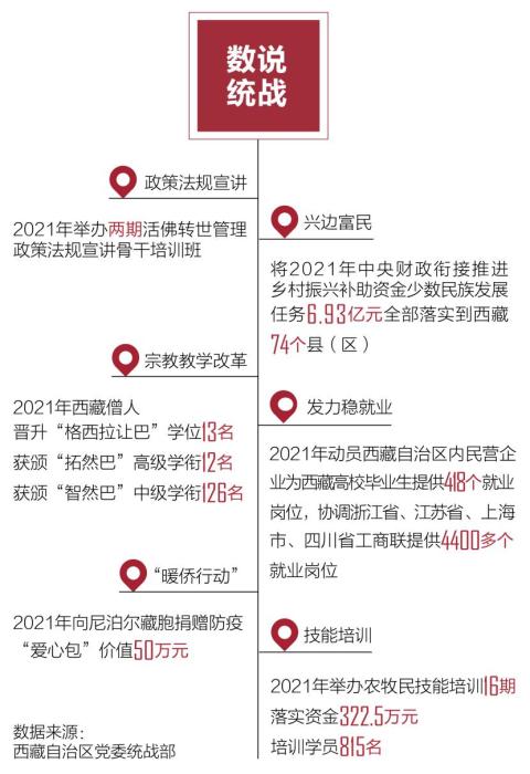 西藏自治區(qū)黨委統(tǒng)戰(zhàn)部介紹,2022年,全區(qū)統(tǒng)戰(zhàn)系統(tǒng)以全力服務(wù)迎接黨的二十大為主線,持續(xù)深化反分裂斗爭,確保國家安全和長治久安。加大活佛轉(zhuǎn)世政策法規(guī)宣傳宣講力度,牢牢掌握反分裂斗爭全局主動性。在鑄牢中華民族共同體意識上見行見效,有效抵御各種極端、分裂思想的滲透,堅決防范民族領(lǐng)域重大風險隱患。