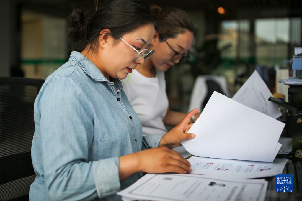 “格桑花開”大學生就業(yè)創(chuàng)業(yè)特訓營學員、西藏藏建科技股份有限公司職員次仁瓊達(左)在工作(2022年6月24日攝)。新華社記者 姜帆 攝