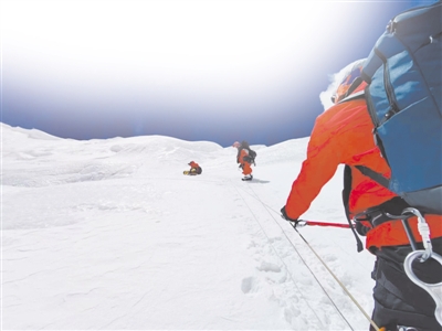 但還是碰上了意外。從8300米再往上走,積雪有五六十厘米深,沿路安全繩都被雪埋了。安全繩是登頂?shù)纳K,大家必須把繩子拽出來,抖掉冰,再一點點前進(jìn)。到達(dá)海拔8800米處,比原計劃晚了三個小時。
