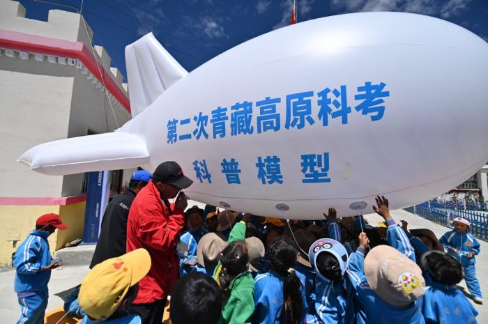 “快看,這個大白鯨飛起來啦!”,海拔4119米的西藏定日縣扎西宗鄉(xiāng)完全小學(xué)附屬幼兒園里,小朋友們看到緩緩起飛的浮空艇模型興奮地喊著。7月13日上午,中科院珠峰站觀測主管席振華用浮空艇模型、科學(xué)小實驗,在這所“珠峰之鄉(xiāng)”幼兒園的新操場上為孩子們上了一堂生動有趣的戶外科普課。