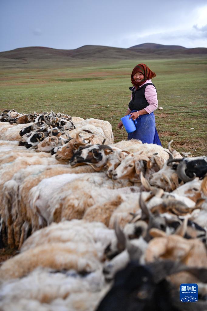 雙湖縣牧民在擠羊奶(7月12日攝)。新華社記者 晉美多吉 攝