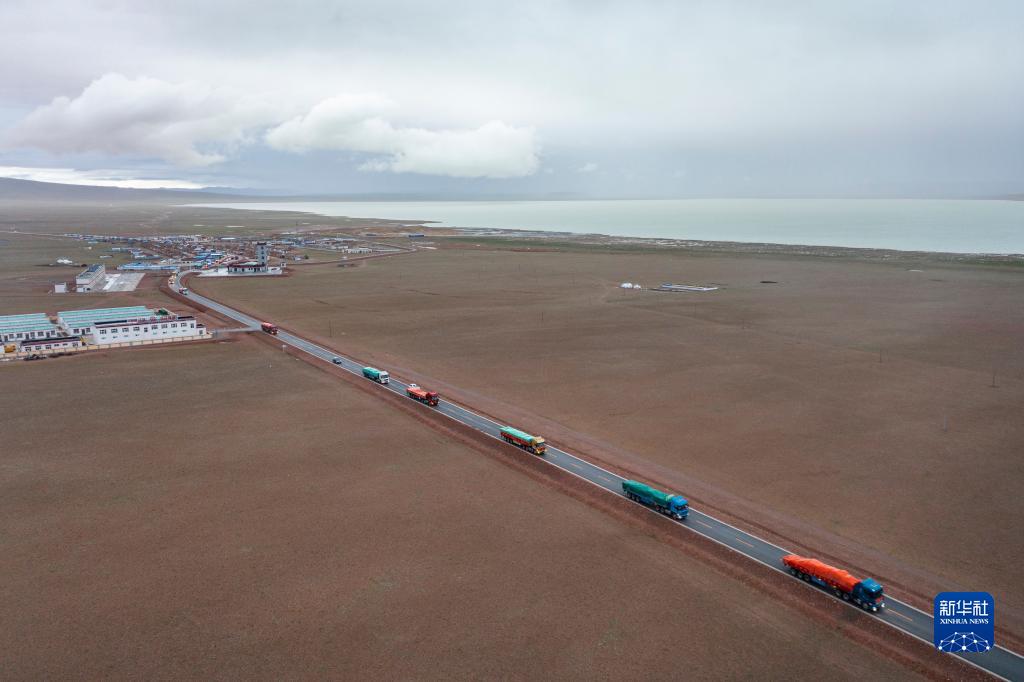 先期運(yùn)送家具的貨運(yùn)車隊(duì)從雙湖縣多瑪鄉(xiāng)出發(fā)(7月15日攝,無人機(jī)照片)。新華社記者 孫非 攝