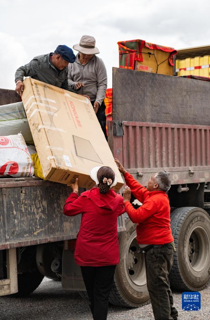 雙湖縣多瑪鄉(xiāng)果根擦曲村的村民將行李搬上貨車(chē)(7月12日攝)。新華社記者 周荻瀟 攝