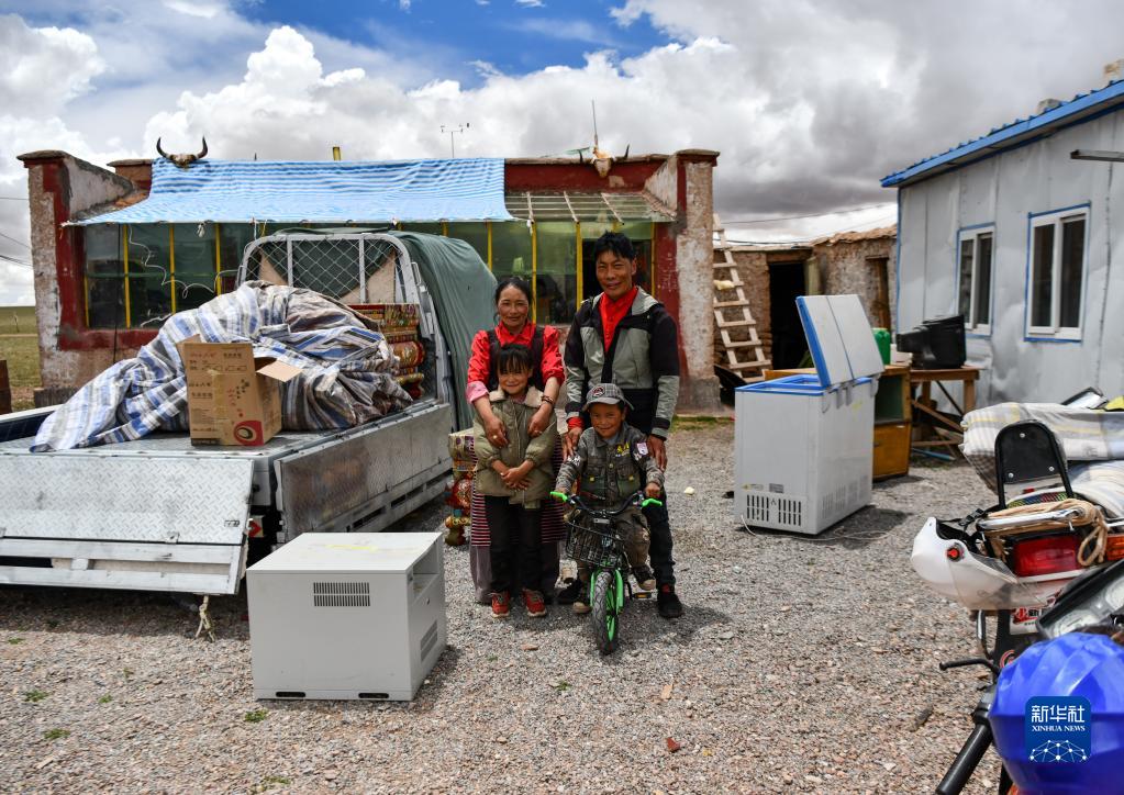 雙湖縣多瑪鄉(xiāng)果根擦曲村牧民貢布旺青和家人在等待運(yùn)送家具的車(chē)輛(7月12日攝)。新華社記者 晉美多吉 攝