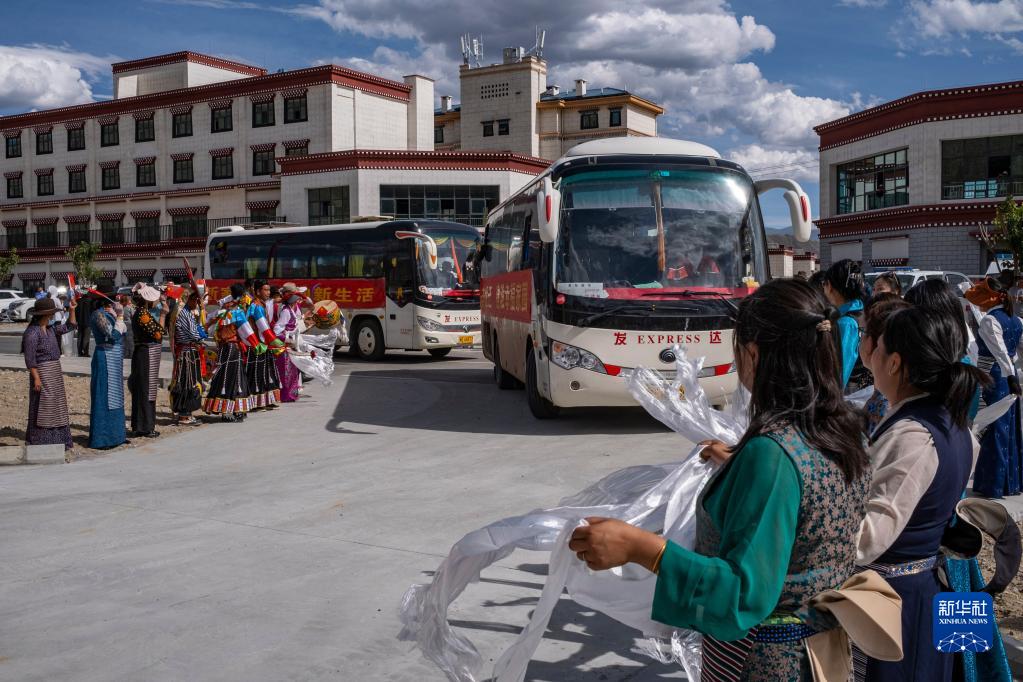 一陣陣激昂的藏戲鼓聲、一聲聲“歡迎到家”的美好祝福,當(dāng)?shù)厝罕娛峙e象征五谷豐登的“切瑪盒”,逐一獻(xiàn)上哈達(dá),迎接新鄰居。