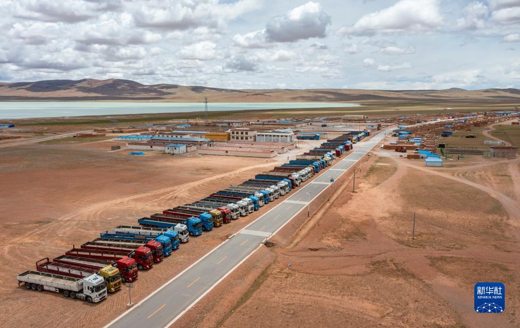 在雙湖縣多瑪鄉(xiāng)拍攝的負(fù)責(zé)運(yùn)送搬遷群眾家具的貨車(7月12日攝,無(wú)人機(jī)照片)。新華社記者 孫非 攝