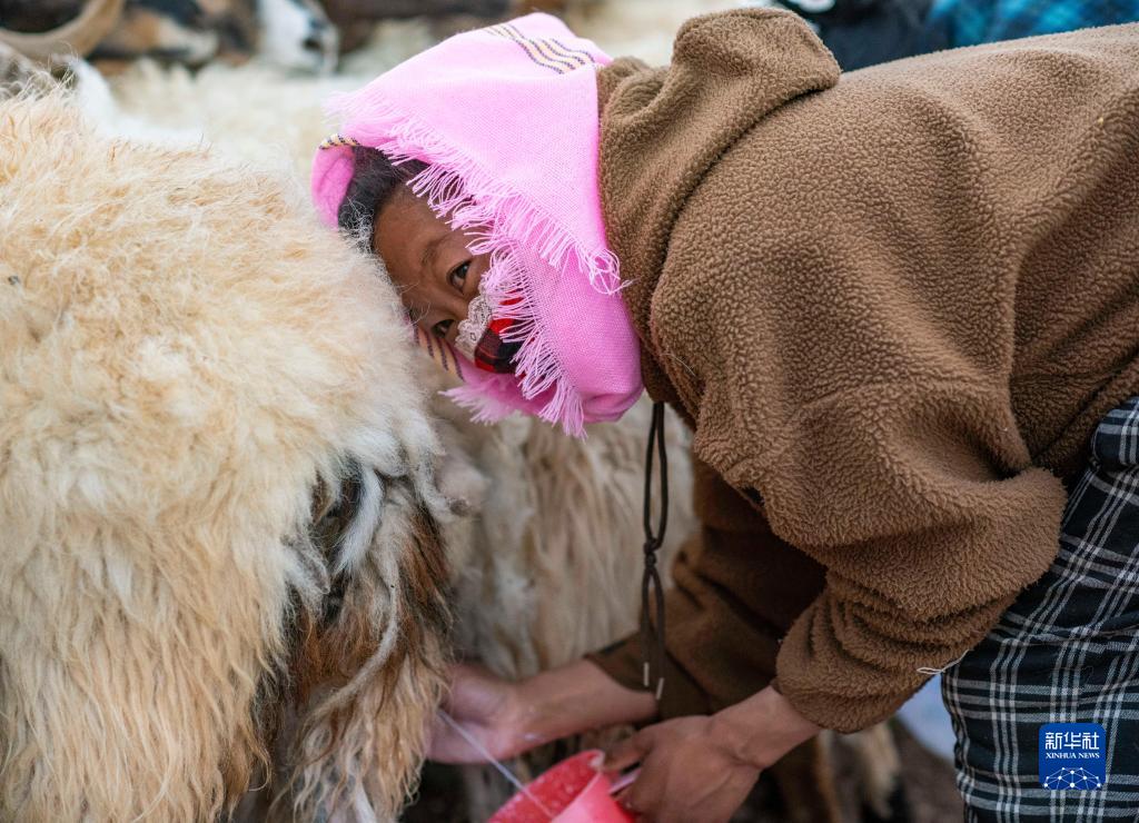 傍晚,男人們放牧歸來(lái),羊群被趕到圍欄邊,嘎瑪?shù)耐鈱O女石秀措姆加入了擠奶的隊(duì)伍。