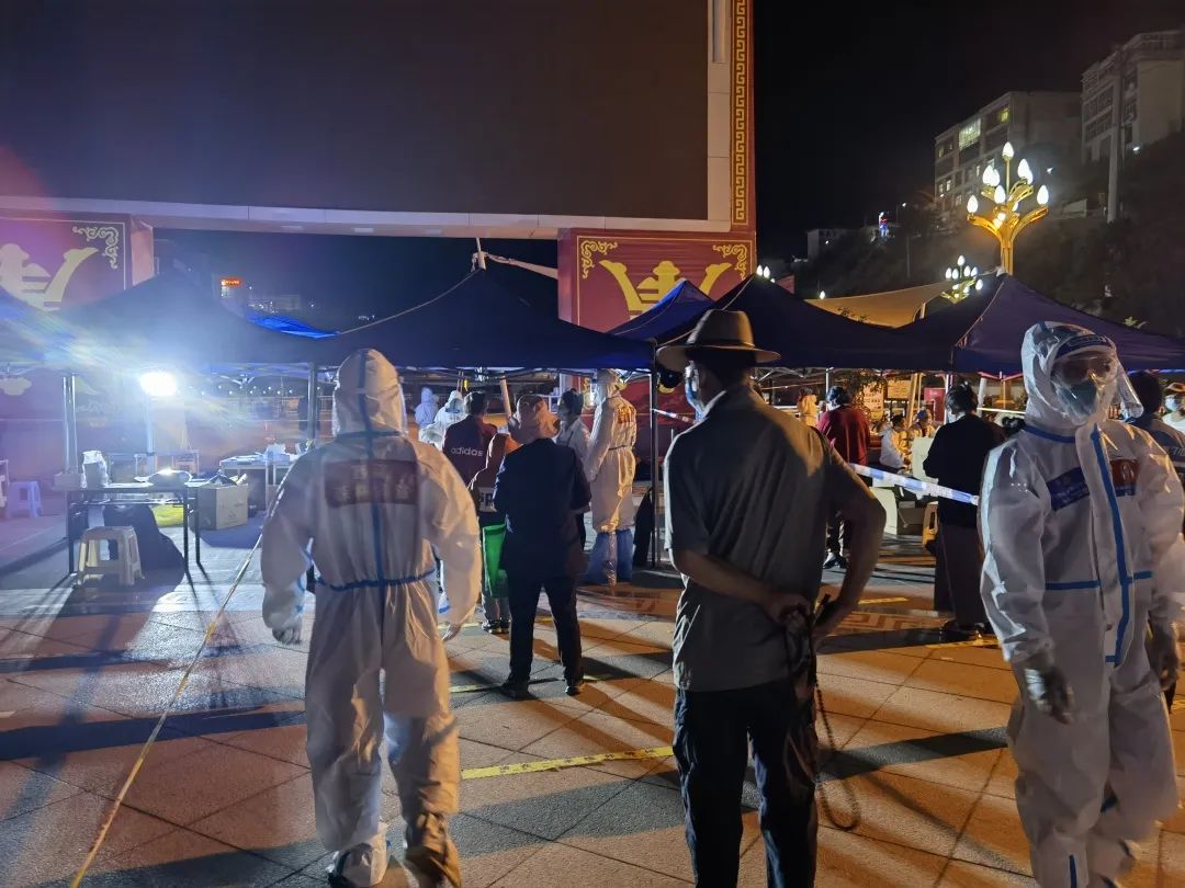 “為了您的安全,請(qǐng)保持1米以上間隔,謝謝?!蓖砩?點(diǎn)多,在茶馬廣場(chǎng),支隊(duì)三級(jí)消防士張興梁,依然堅(jiān)守在抗疫一線(xiàn),維持著排隊(duì)做核酸的長(zhǎng)隊(duì)。從早上7點(diǎn)開(kāi)始,張興梁和其他消防隊(duì)員已堅(jiān)守了14個(gè)多小時(shí)?!拔鞑貢円箿夭钐卮?,白天防護(hù)服里面衣服都濕透了,但是到晚上這個(gè)點(diǎn)已經(jīng)干了,正好不用換衣服了?!睆埮d梁打趣的說(shuō)到。