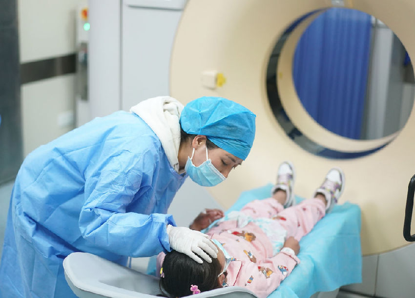 5月12日,南京醫(yī)科大學(xué)第二附屬醫(yī)院的護士在安慰準備接受CT增強檢查的小患者。新華每日電訊記者季春鵬攝