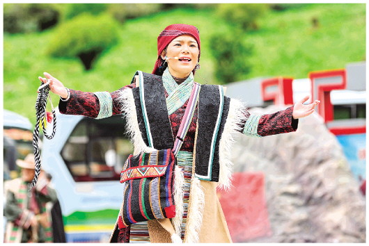5月31日,演員在隆子縣玉麥鄉(xiāng)文化廣場表演歌舞劇《天邊格?;ā贰?新華社記者張汝鋒攝