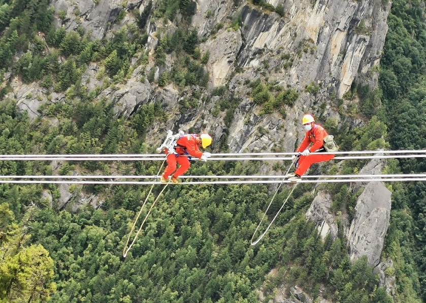 9月17日,電力施工人員正在懸崖峭壁間運輸工器具。次仁桑布攝