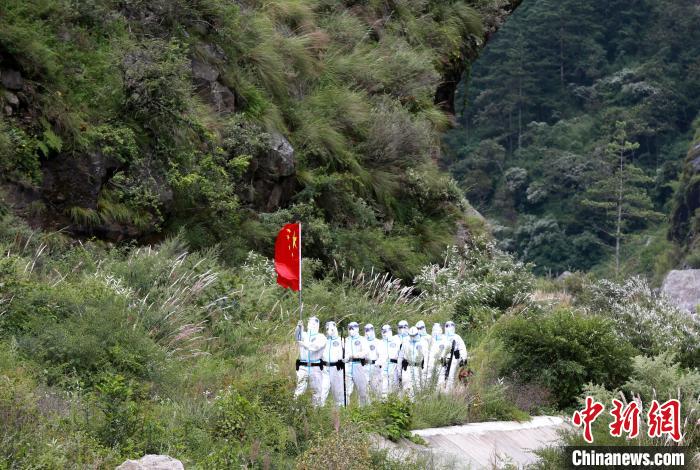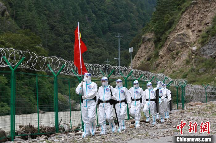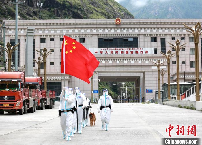 10月1日,駐扎在中尼邊境的吉隆出入境邊防檢查站組織移民管理警察高舉國(guó)旗在邊境執(zhí)勤巡邏任務(wù)。