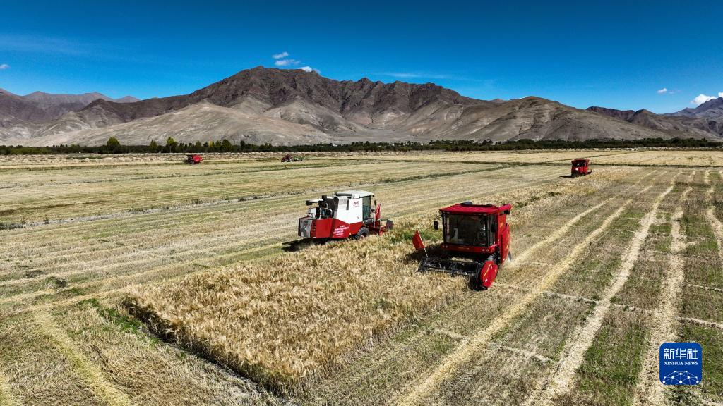 日喀則市江孜縣努康村村民在進(jìn)行機(jī)械化收割。新華社記者 晉美多吉攝