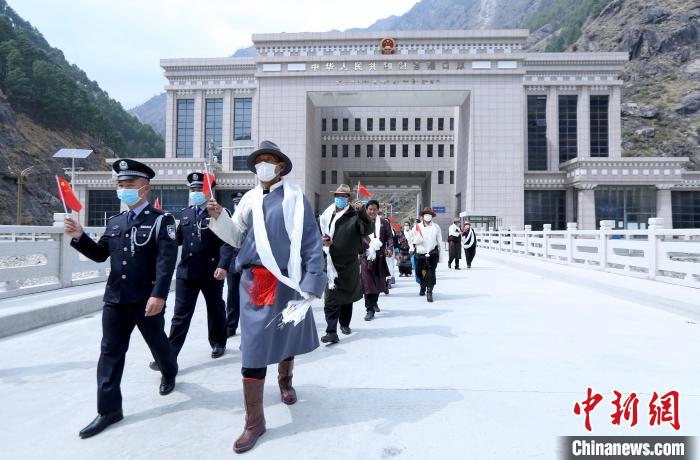 吉隆出入境邊防檢查站移民管理警察帶領退休干部參觀新建熱索大橋。 肖富貴 攝