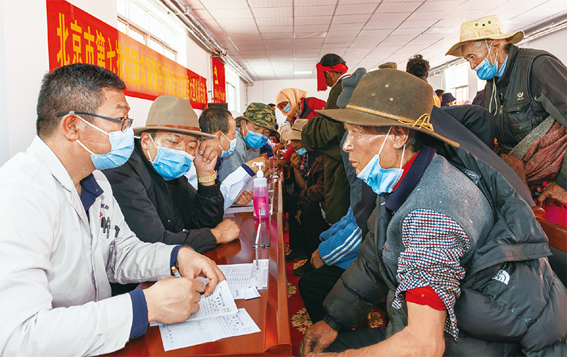 2022年6月9日,來自拉薩市人民醫(yī)院的北京市第七批“組團(tuán)式”援藏醫(yī)療專家,來到當(dāng)雄縣格達(dá)鄉(xiāng)為居民義診?!⌒氯A社記者 周荻瀟/攝