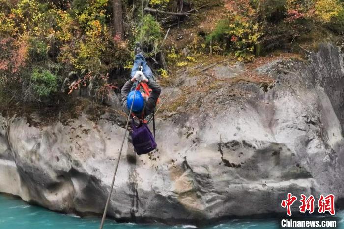 看到具美丹增安全抵達對岸后,陳來尼瑪拿出一條事先準備好的尼龍繩,系在了朗尼的安全帶上。