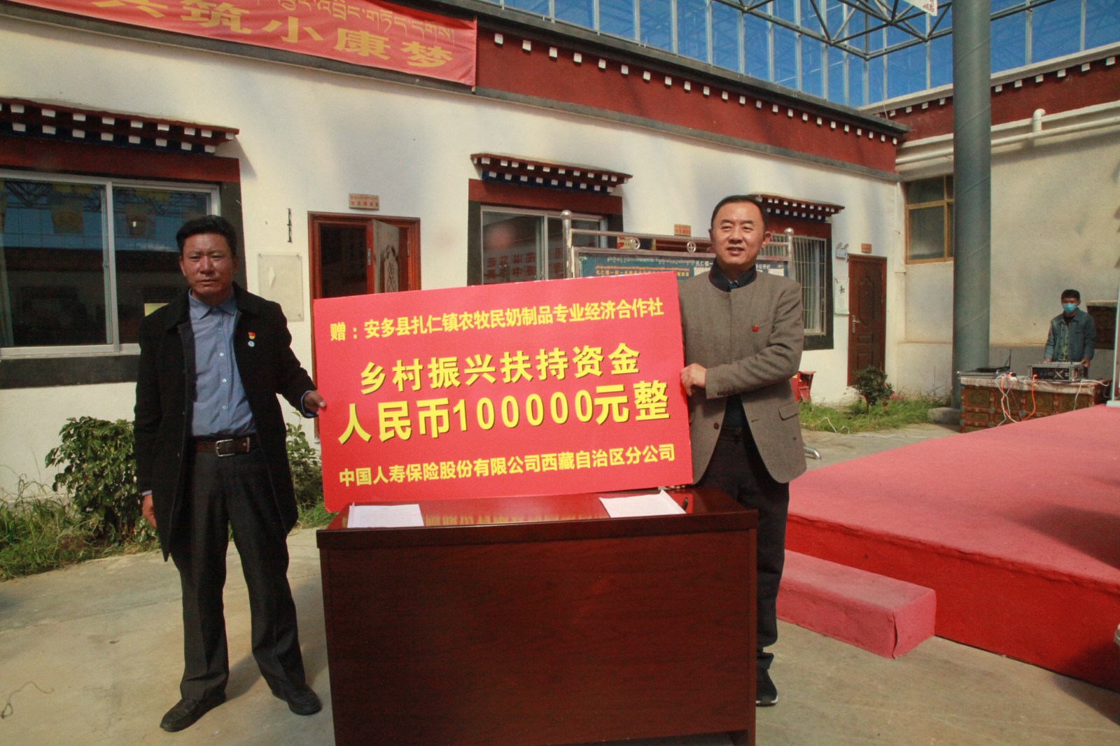 圖為中國(guó)人壽西藏分公司向那曲市安多縣扎仁鎮(zhèn)納色社區(qū)捐贈(zèng)產(chǎn)業(yè)扶持資金10萬元。