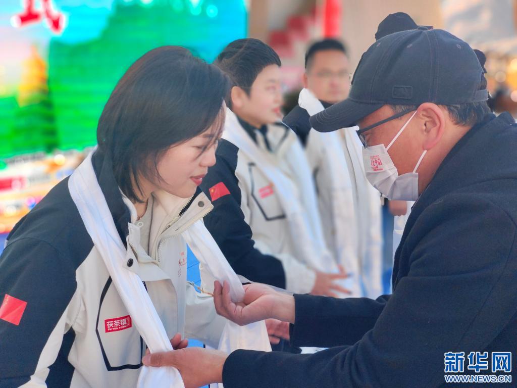 抵達(dá)終點(diǎn)后,車隊(duì)成員接受哈達(dá)(12月23日攝)。記者劉洲鵬 攝