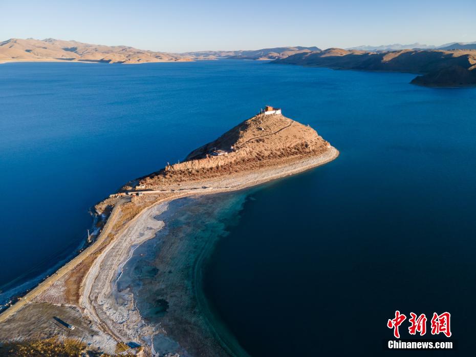 近日,西藏自治區(qū)山南市羊卓雍錯(cuò)(簡(jiǎn)稱(chēng)羊湖),冬日由于沒(méi)有云層遮擋,湖水更顯深藍(lán)、孔雀藍(lán)。航拍視角下,湖水像巨大的寶石鑲嵌于高原大地,風(fēng)光壯麗。羊卓雍錯(cuò)藏語(yǔ)意為“碧玉湖”,湖面海拔4441米,與納木錯(cuò)、瑪旁雍錯(cuò)并稱(chēng)西藏三大“圣湖”。圖為羊湖著名景點(diǎn)日托寺。 江飛波 攝