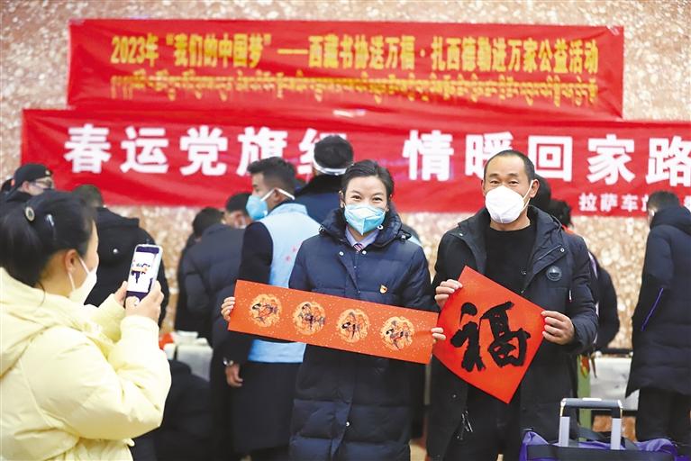 7日,拉薩火車站“天路格?;ā秉h員突擊隊(duì)開展兔年大吉心愿墻、新春猜謎送祝福等活動,提升鐵路運(yùn)輸服務(wù)品質(zhì),讓旅客安心、順心出行。圖為拉薩火車站的工作人員將“?!弊炙徒o旅客。記者 楊小娟 旦增蘭澤 攝