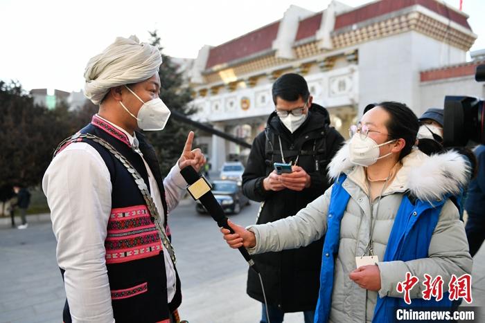 1月12日,政協(xié)第十二屆西藏自治區(qū)委員會第一次會議在拉薩開幕,西藏政協(xié)文化藝術節(jié)界委員迪龍(左)接受媒體的采訪。 中新社記者 貢嘎來松 攝