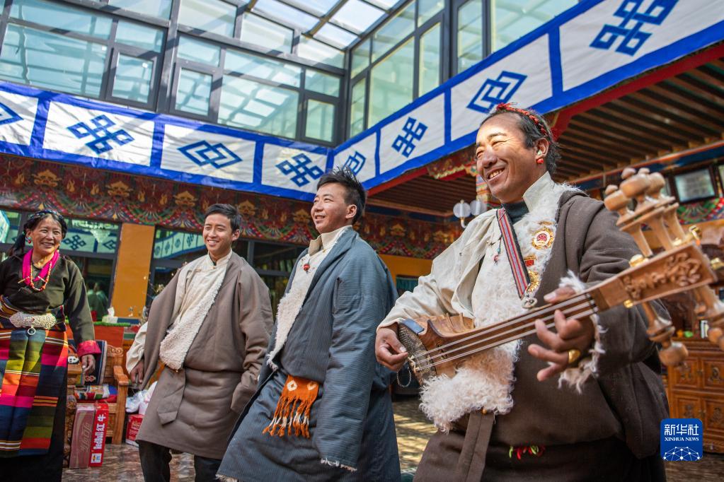 在藏歷農(nóng)家年的家庭聚會中,人們彈奏扎念琴(1月23日攝)。新華社記者 孫非 攝