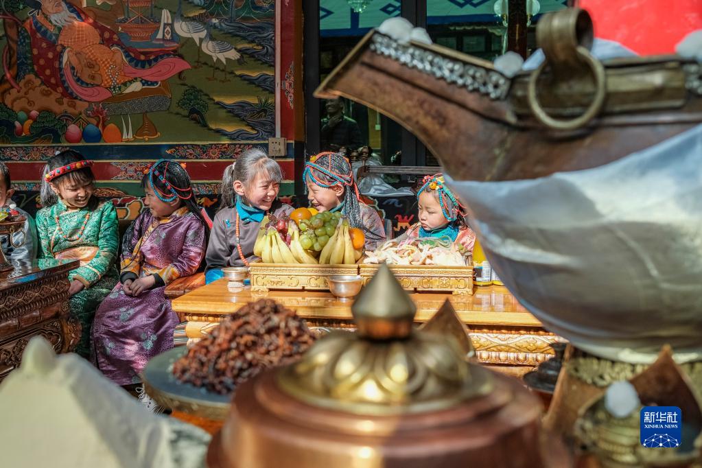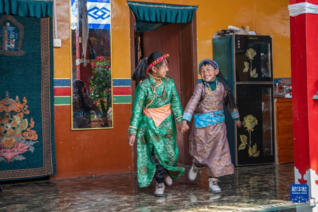 今年,日喀則藏歷農(nóng)家年和春節(jié)“巧遇”同一天,雖習(xí)俗不同,但年味皆濃。次旦的兒孫早早開車去縣城采買了年貨,兒媳婦們在家準(zhǔn)備過年吃的羊頭、切瑪?shù)葌鹘y(tǒng)特色美食。家中的第四代,次旦老人的重孫子和重孫女們,則穿上了漂亮的藏裝,頭戴綠松石點綴的頭飾,在家中歡快地跑來跑去。