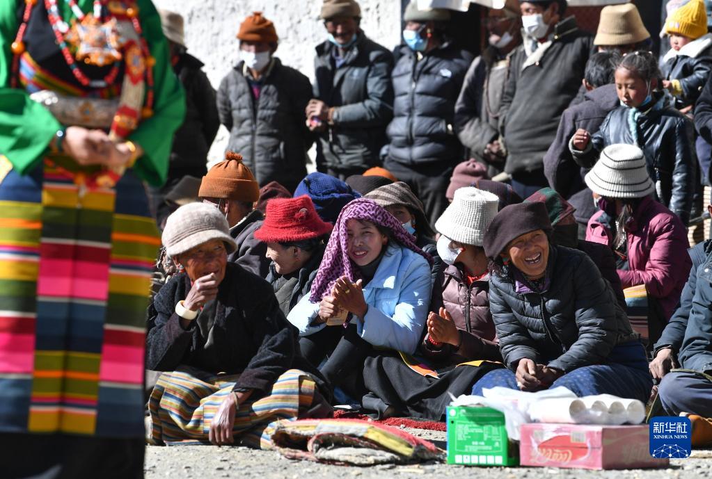 西藏日喀則市芒普鄉(xiāng)普村村民觀看文藝演出隊(duì)表演(1月21日攝)。新華社記者 晉美多吉 攝