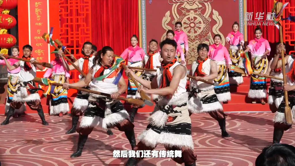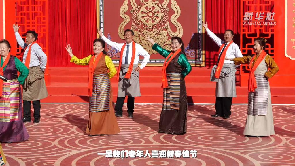 農(nóng)歷癸卯兔年春節(jié)大年初一,西藏拉薩市娘熱街道吉蘇4組的村民們身著節(jié)日盛裝,在家門口觀看娘熱民間藝術(shù)團(tuán)演繹的2023年西藏“啟航新征程 幸福中國年”村晚。