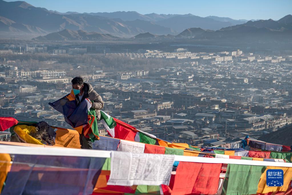 1月24日,日喀則市桑珠孜區(qū)的藏族群眾在山上懸掛五彩經(jīng)幡。新華社記者 晉美多吉 攝