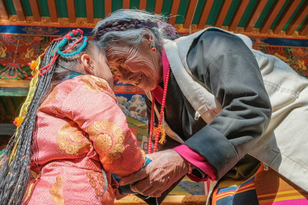 今年,西藏農(nóng)家年和春節(jié)“巧遇”同一天,習俗雖不同,但年味皆濃。從縣城買來的年貨,一家人制作的切瑪和卡塞(油炸面食)等傳統(tǒng)供品和食品,紛紛擺上了桌。第四代的孩子們,也換上了嶄新的藏裝,頭戴綠松石點綴的頭飾,依偎在祖奶奶次旦的身旁。
