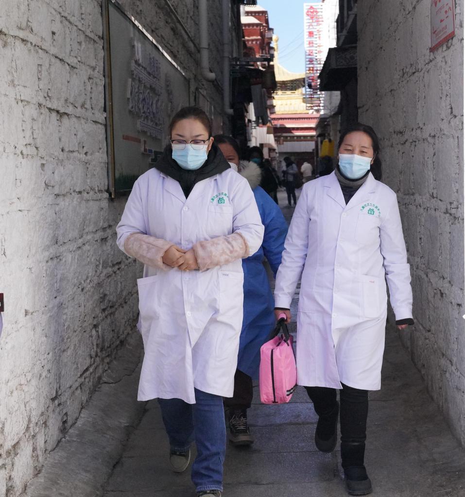 拉薩市八廓街道內,醫(yī)生拉吉(右一)和她的同事們在入戶隨訪途中。新華社記者黃耀漫 攝