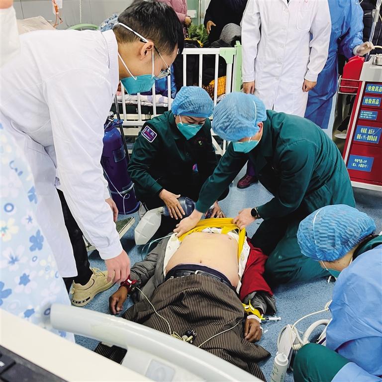 急診科值班醫(yī)生陳勝、副護(hù)士長趙文熠等立即攜搶救車、除顫儀趕赴現(xiàn)場(chǎng),此時(shí),冬某意識(shí)喪失、頸動(dòng)脈搏動(dòng)消失、呼吸極其微弱。見患者病情危及生命,醫(yī)護(hù)人員立即實(shí)施搶救工作。急診醫(yī)護(hù)團(tuán)隊(duì)配合默契,胸外心臟按壓、球囊輔助通氣、建立靜脈通道、靜推腎上腺素、查心電圖、監(jiān)測(cè)生命體征、吸痰……一切有條不紊地進(jìn)行著。隨后,心電圖提示室顫,醫(yī)護(hù)人員立即予以非同步200J電除顫1次,待轉(zhuǎn)運(yùn)床到位后立即轉(zhuǎn)運(yùn)患者至搶救室進(jìn)一步救治,轉(zhuǎn)運(yùn)過程中心肺復(fù)蘇不間斷。