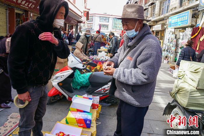 圖為2月13日,拉薩沖賽康市場(chǎng)周圍,市民(右)向29歲的巴桑(左)購買藏歷新年年貨酥油花。中新社記者 江飛波 攝