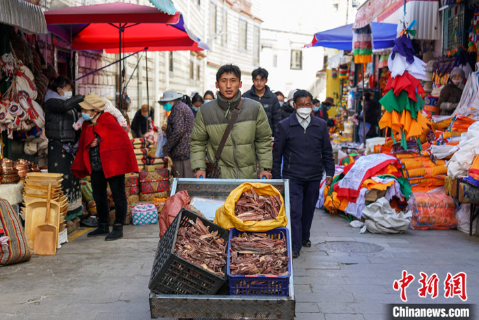 圖為2月13日,拉薩老城區(qū)沖賽康市場(chǎng)人流如織。中新社記者 江飛波 攝