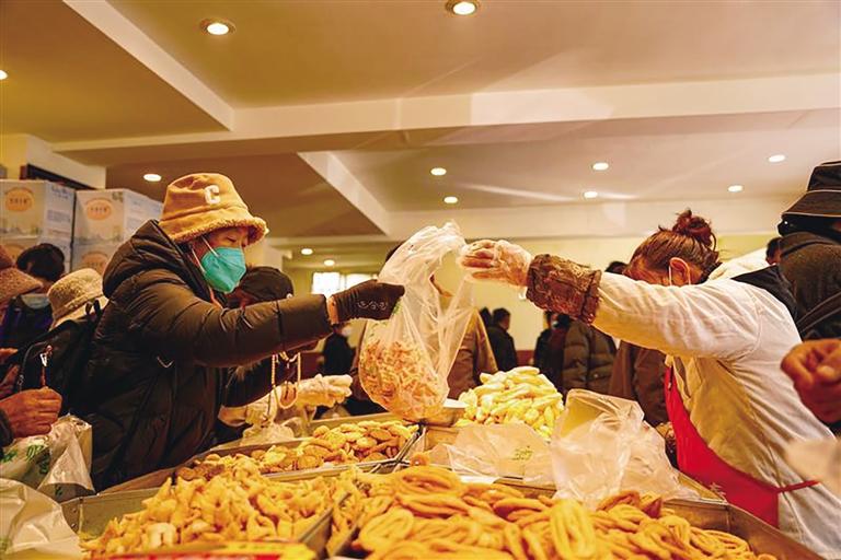 不遠處,尼珍藏式卡塞店的店員們正忙著制作“卡塞”,揉面、切割、染色,面片經(jīng)店員們的巧手捏成長條形、圓形、蝴蝶形等不同樣式,最后放到油鍋炸至金黃,出鍋后瀝油再撒上白糖,香甜可口、樣式精美的卡塞就制作完成了。新鮮出爐的卡塞顏色金黃、香氣四散開來,市民們爭相選購?!拔覀冏隹ㄈ呀?jīng)25年了,今年1月10日開門營業(yè),很多老顧客就來光顧了,每天收入在2000元至3000元之間,而且我們選用的原材料比較好,再加上現(xiàn)場制作、新鮮銷售,生意好的時候賣得更多?!崩习迥嵴涓嬖V記者:“我們店制作的卡塞價格實惠,連續(xù)8年沒有漲價,每斤30元,今年準備營業(yè)到藏歷十二月二十九(公歷2月19日)歇業(yè)。”