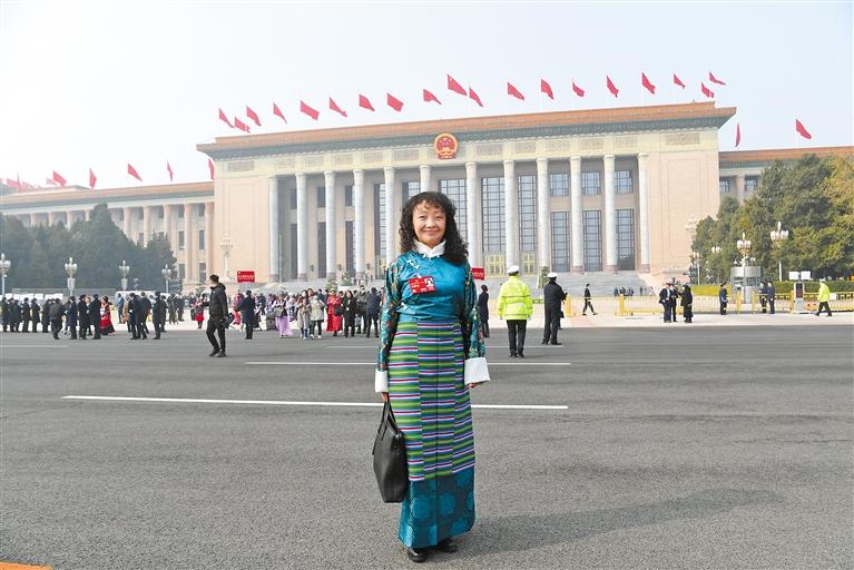 圖為全國人大代表白瑪措在人民大會堂前拍照留念。 記者 李洲 攝