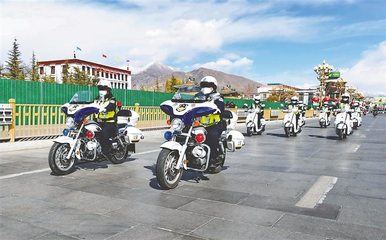 拉薩市公安局交警支隊(duì)城北大隊(duì)女子中隊(duì)的交警正在巡邏。唐斌 攝