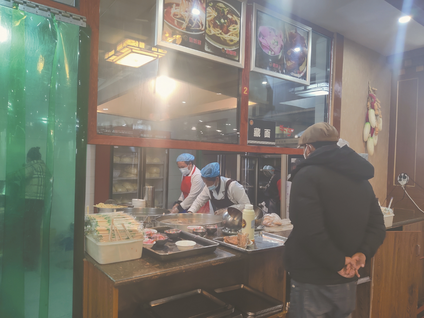一大早,位于城關(guān)區(qū)仙足島的嚓榮魯突陸藏餐館續(xù)迎來顧客。檔口內(nèi),工作人員在各自崗位上忙碌著。抓一把面,放上牛肉丁,撒上香蔥,再澆上一勺牛肉湯,一碗熱氣氤氳、香味四溢的藏面新鮮出鍋,再配上甜茶和肉餅,美好的一天就在此刻開啟。作為一家連鎖店,嚓榮魯突藏餐館在拉薩市區(qū)及各縣(區(qū))、地市共有17家分店,在食材、衛(wèi)生等方面,均采取嚴(yán)格統(tǒng)一的管理標(biāo)準(zhǔn)。