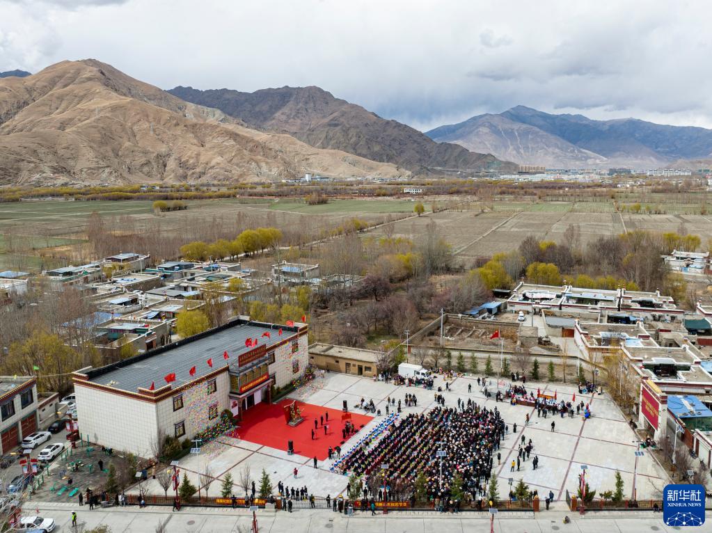 3月28日,在山南市乃東區(qū),西藏民主改革第一村陳列館重新開放,人們?cè)陉惲叙^前舉行儀式,紀(jì)念西藏百萬(wàn)農(nóng)奴解放64周年(無(wú)人機(jī)照片)。新華社記者 孫非 攝