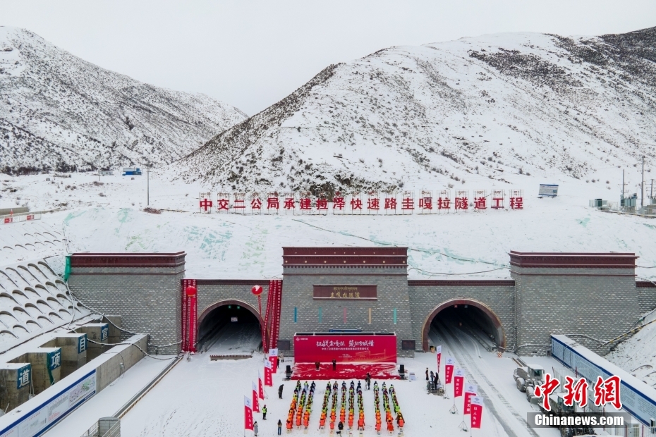 3月28日,西藏S5線拉薩至澤當(dāng)快速通道項(xiàng)目控制性工程圭嘎拉隧道左洞實(shí)現(xiàn)貫通。圖為西藏圭嘎拉隧道左洞貫通儀式現(xiàn)場(chǎng)。(無(wú)人機(jī)畫(huà)面)