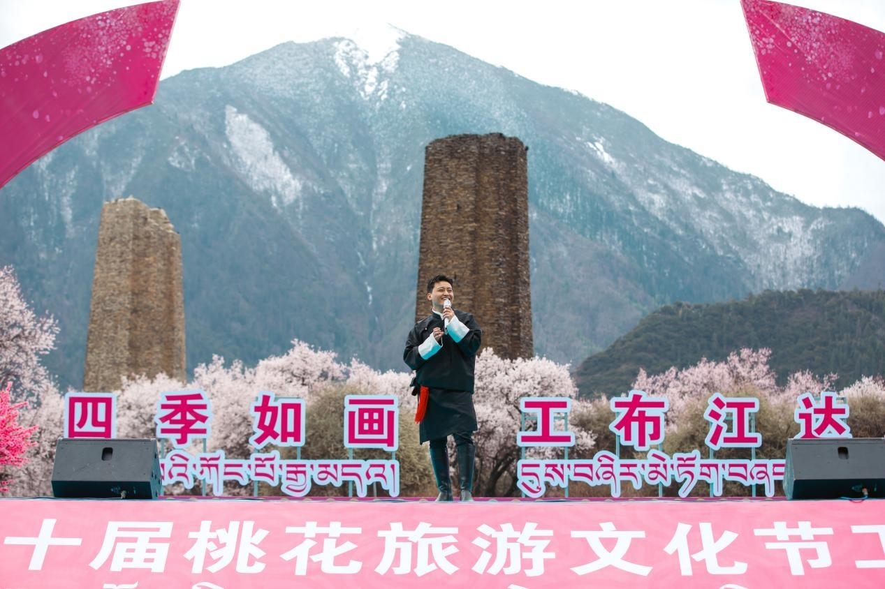 皚皚雪山下,千年古堡旁,灼灼桃花,花開正艷。羅布桑珠、巴金旺甲、齊旦布、桑杰才讓等藏族知名歌手、工布江達本地歌手、當(dāng)?shù)厝罕婟R聚,流行歌曲與工布民歌等當(dāng)?shù)靥厣硌萁Y(jié)合,為網(wǎng)友們獻上了一場桃花樹下的歌舞盛宴。